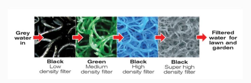 WaterMate filters your greywater through a set of filter mats, removing hair, lint, and other debris, so it’s suitable for watering trees, shrubs, or flower gardens. Please note: this unit only filters the water — it does not disinfect or “clean” it.